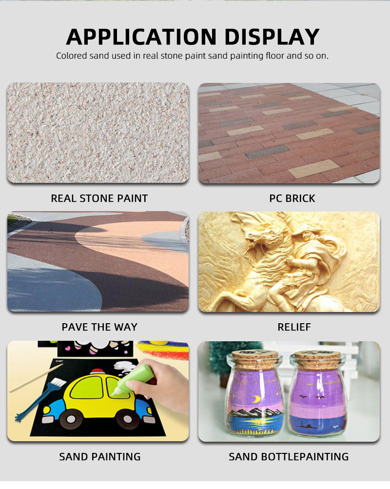 Colored sand has super fun magic that turns boring little moments into awesome creative adventures. It’s not just for craft tables or home shelves—you’ll find it popping up in all kinds of unexpected spots, blending with daily activities to bring big smiles and cool ideas. Run fingers through it, and it sifts through gently, like tiny rainbow bits dancing between digits. Those soft grains and bright, happy hues make it super versatile—fits right into so many things without losing that cozy, fun charm everyone loves.Schools and preschools totally love using colored sand for fun learning. They fill big bins with it—called sensory bins—and let little kids dig, sift, and play to get better at using their tiny hands, all while gawking at all the pretty colors. Teachers turn lessons into games: kids trace letters or draw shapes in sand while singing songs, making math and reading feel like playtime, not work. Sometimes everyone teams up to make huge sand murals—each kid dumps their favorite color, and together they make something awesome, learning to share and talk with each other along the way. It’s how learning should be—fun, messy, and full of giggles, with sand making every step feel like an adventure.Shop windows use colored sand to grab attention—like little colorful magnets for passersby. Cute boutiques change their displays with seasons: soft pastels for spring dresses, warm oranges and browns for autumn sweaters—arranged into tiny scenes, like sand flowers or mini pumpkins, that match what they’re selling. Cosmetic stores get clever too—they use shimmery sand to look like highlighter, or matte sand to mimic lipstick texture, so you can instantly get what the products feel like. Even cafes and bookstores join in, decorating windows with sand art—quotes from favorite books or tiny coffee cups drawn in sand—making you stop, smile, and maybe pop in for a drink or a book. It turns boring storefronts into little art shows everyone can enjoy.Art therapy sessions use colored sand to help people relax and let out their feelings—no fancy words needed. Therapists say things like, “Grab that sand, pour it, mix it, make whatever feels right,” and people do just that. Pouring sand from one jar to another, swirling colors together, or making simple dots and lines—those slow, easy motions make stress melt away. Clients say handling sand feels like a hug for the mind; focusing on how soft it is and how pretty the colors are makes all the worries fade. Bright yellows and pinks for happy days, soft blues and purples for calm moments, deep greens for when you’re thinking hard—sand lets you show how you feel without saying a thing. It’s a simple, gentle way to feel better, one grain at a time.Festivals get way more fun with colored sand sprucing things up. Music festivals line stages and walkways with it—some even use glow-in-the-dark sand that lights up at night, making the whole place look like a fairyland. Cultural festivals mix sand into their traditions, with different colors standing for happy things like good luck or friendship. Halloween uses dark, spooky sand shaped into little ghosts or pumpkins, and Christmas has white and red sand made into tiny snowmen or candy canes. People even add sand to their festival outfits—sew little packets of it into hems or pin them to hats—so they jingle a little and look extra festive as they dance or walk around. Sand turns regular festivals into memories you’ll talk about forever.People who love making tiny worlds—micro landscapes—swear by colored sand. They grab glass jars or boxes, layer sand in different colors: blue for oceans, green for grass, brown for dirt, and white for little snow-capped mountains. Then they add tiny plants, little rocks, or even mini toy people and houses to make the scene feel real. These tiny masterpieces sit on desks or shelves, bringing a little bit of nature into apartments or offices. Fans love sharing tips online too—like how to mix sand with glue to keep layers from shifting, or how to add tiny lights to make the whole thing glow. It’s a super chill hobby that lets you be a tiny god of your own little colorful world.Colored sand even pops up in photos and movies—making regular shots look way cooler. Photographers lay jewelry, small gadgets, or even makeup on beds of colored sand to take product photos; a little necklace on pink sand or a phone on blue sand instantly makes the item look more fun and eye-catching. Filmmakers use sand to make sets look real—desert scenes with golden sand, beach scenes with mixed tan and blue sand—or to add symbolic touches, like sand flowing to show time passing. Some music videos have sand art performances too: artists draw pictures in sand that change as the song plays, telling stories with colors and shapes. It’s crazy how sand turns regular visuals into something everyone stops to watch.What makes colored sand stick around is that it’s simple but totally amazing. You don’t need to be a pro to use it—just grab some, play around, and see what happens. Kids love it, adults love it, and everyone in between finds joy in its colors and texture. In a world where everything feels so complicated with phones and computers, sand is a breath of fresh air. It’s humble, it’s cheap, but it can make any day brighter and any space more fun. It keeps popping up in new places, bringing color and smiles wherever it goes—and that’s why everyone loves it so much. -